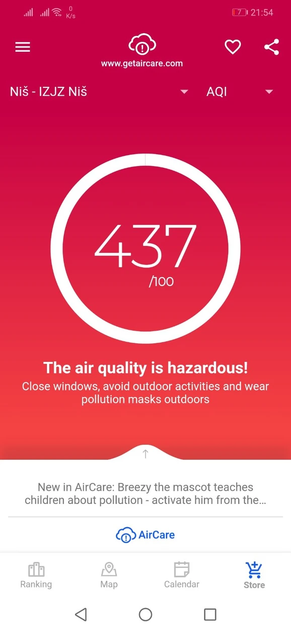 Град Ниш јуче је у вечерњим часовима био најзагађенији град у Европи, показују подаци страних сајтова за мерење загађења ваздуха. По њима је у једном тренутку измерено загађење у Нишу било 343, а у другом чак 437 јединица по AQI (међународном индексу загађења).